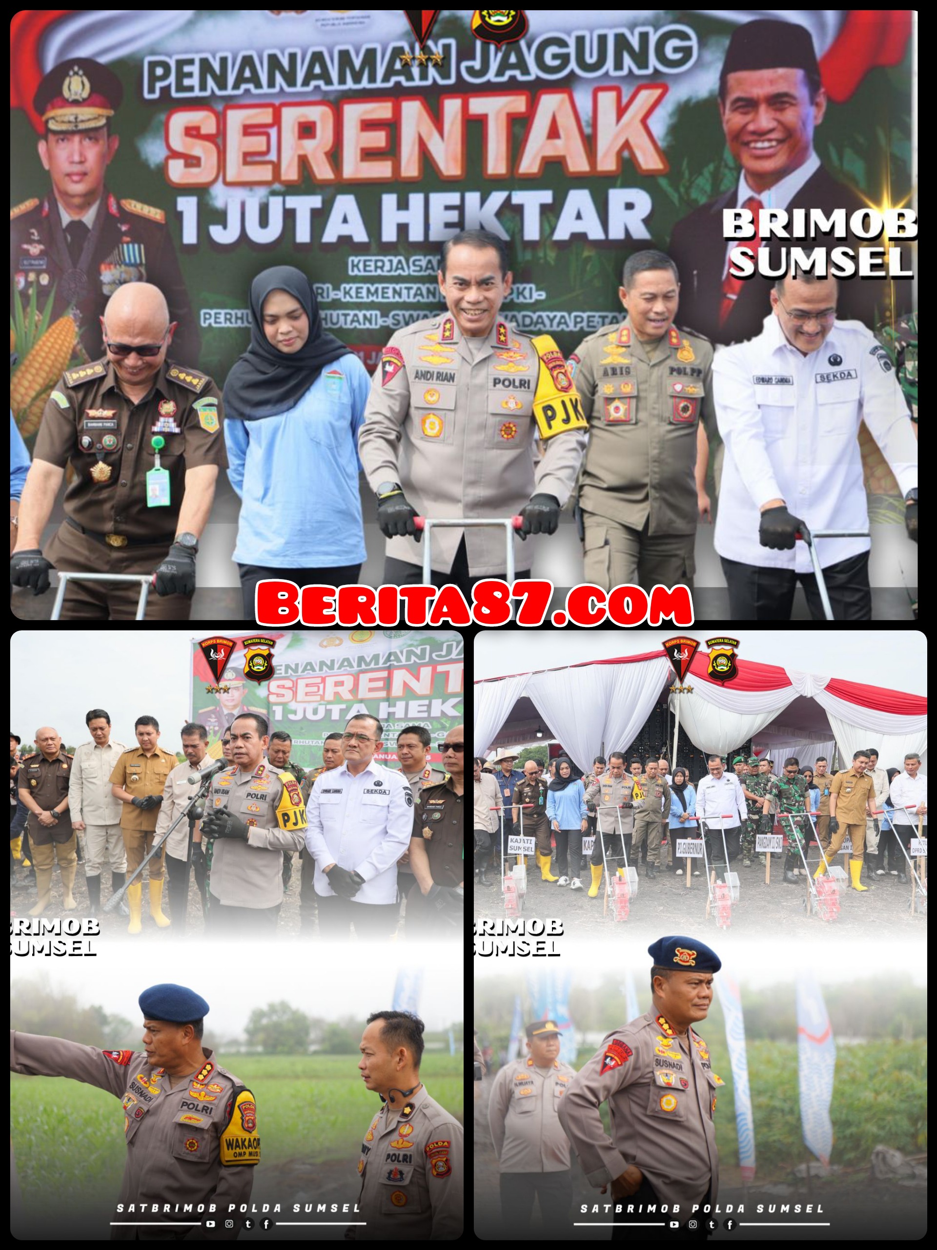 Palembang – Kapolda Sumatera Selatan, didampingi oleh Dansat Brimob Polda Sumsel Kombes Pol Susnadi, S.I.K., serta Pejabat Utama Polda Sumsel, menghadiri kegiatan Penanaman Jagung Serentak Satu Juta Hektar Lahan. Program ini merupakan bagian dari upaya pemerintah untuk mendukung swasembada pangan nasional.
