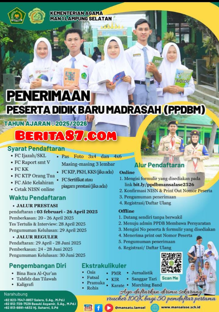 Lampung Selatan – Madrasah Aliyah Negeri (MAN) 1 Lampung Selatan kembali membuka Penerimaan Peserta Didik Baru Madrasah (PPDBM) untuk tahun ajaran 2025/2026. Pendaftaran dibuka dalam dua jalur, yaitu Jalur Prestasi dan Jalur Reguler, dengan berbagai persyaratan dan prosedur yang telah ditetapkan.