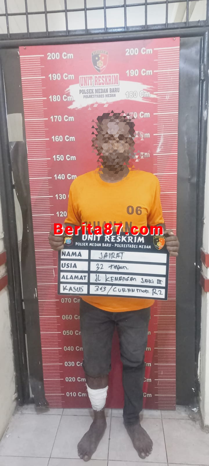 Medan, update87.com-Tim Reskrim Polsek Medan Baru menembak kaki seorang terduga pelaku pencurian sepeda motor (Curanmor) di Jalan Listrik Kelurahan Madras Hulu Kecamatan Medan Petisah, Selasa (11/2/2025).