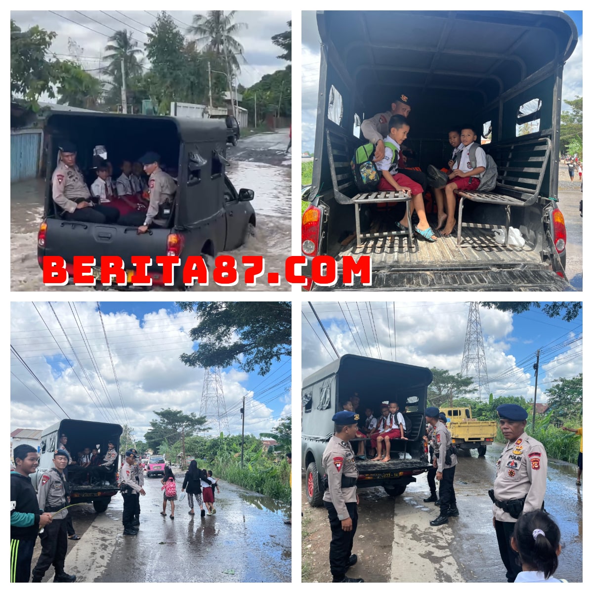 Tim SAR Batalyon A Pelopor Satbrimob Polda Sumsel dengan sigap membantu anak-anak sekolah melewati banjir di daerah Gandus