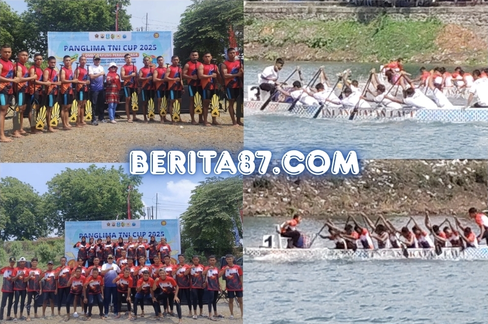 Mojokerto – Semangat bahari dan jiwa kebersamaan tampak menyala di Sungai Taman Brantas Indah, Gedeg, Kabupaten Mojokerto, Minggu (29/9/2025), saat digelar Lomba Dayung Perahu Naga Panglima TNI Cup 2025 dalam rangka memperingati HUT ke-80 TNI. Ajang bergengsi ini diikuti 24 tim terbaik dari kategori umum maupun TNI/Polri, yang berlaga menaklukkan jarak 500 meter dengan kekompakan dan kekuatan penuh.