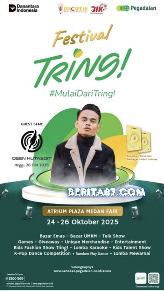 Medan – PT Pegadaian kembali menghadirkan gebrakan inovatif lewat Festival Tring!, sebuah ajang edukatif dan hiburan yang akan digelar pada 24–26 Oktober 2025 di Atrium Plaza Medan Fair.
