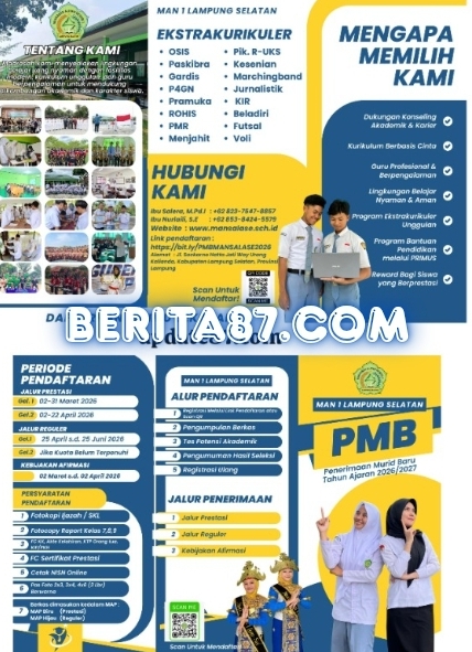 Lampung Selatan , Berita87.com – Madrasah Aliyah Negeri (MAN) 1 Lampung Selatan secara resmi membuka Penerimaan Murid Baru (PMB) Tahun Ajaran 2026/2027. Pendaftaran dibuka melalui beberapa jalur penerimaan guna memberikan kesempatan seluas-luasnya bagi lulusan SMP/MTs yang memiliki potensi akademik maupun nonakademik.