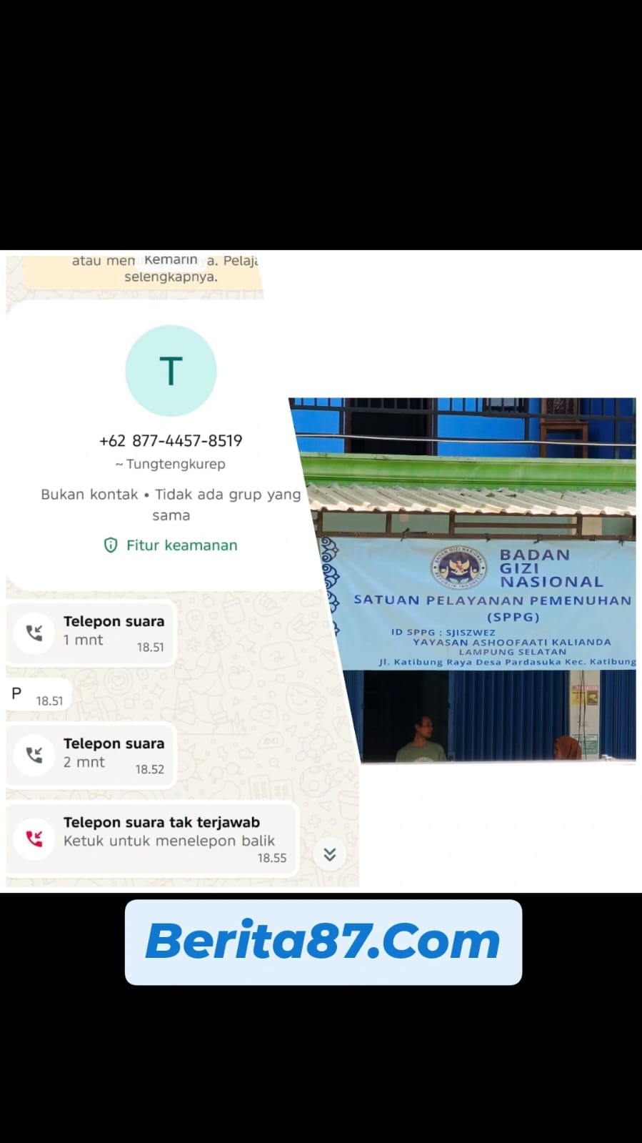 Menurut keterangan yang dihimpun, setelah pemberian MBG berlangsung, salah satu awak media dari Nasional Potret menerima panggilan telepon dari nomor tidak dikenal: 0877-4457-8519.